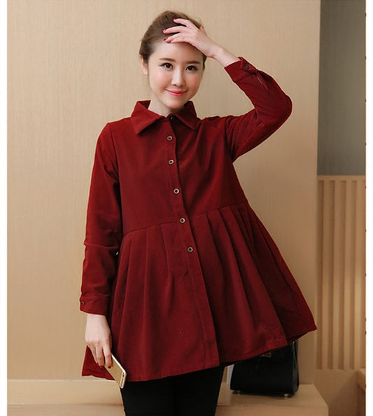 1076# Pleated Waist Button Corduroy Maternity Blouses 2017 Spring Korean Fashion Pregnancy Tunic Tops Clothes For Pregnant Women